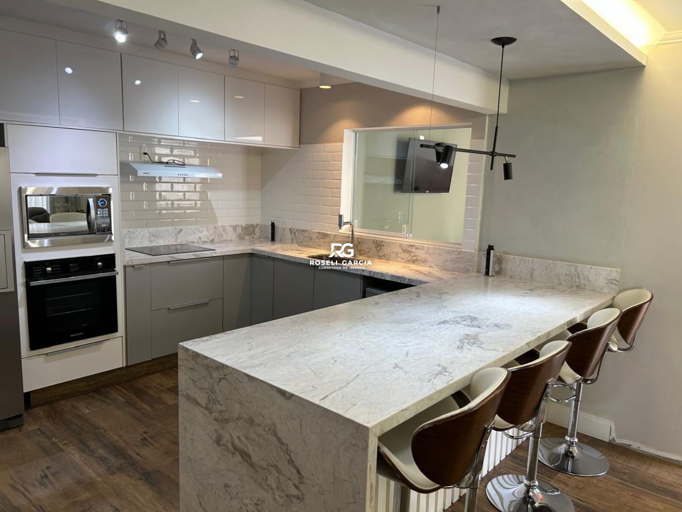 - cozinha planejada conceito aberto com cooktop de indução, coifa, forno elétrico e forno microondas